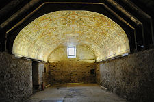 Nothing, not even the pictures on this page, can prepare you for the surprise you get when the lights come on. You find yourself in a long, concrete floored and stone walled building that looks every bit as agricultural internally as externally, except that its eastern half is topped off by an utterly magnificent wooden barrel-vaulted ceiling that is entirely covered with stunningly painted panels.