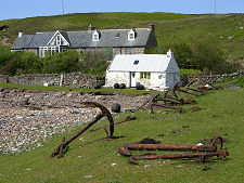 Turning onto this loop of road first takes you past the pebble beach at Badentarbat and the interesting collection of anchors, buoys and other artefacts lined up at its far end. Beyond is the pier that today provides the main access to Tanera Mor, the largest of the Summer Isles. The island has no permanent population, but a fishing station was established there by the British Fisheries Society in 1784, and at the height of the herring boom up to 200 vessels would be based there during the season.