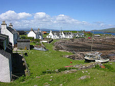 On the slight headland at the south-west end of the line of cottages, almost blending into the grass surrounding them, are another line of crofts, now barely identifiable as gray stone ruins.