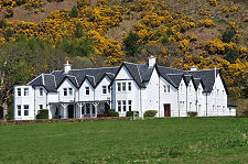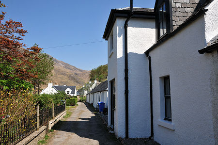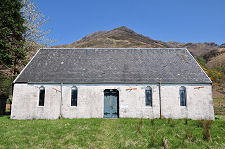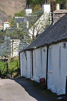 Arnisdale comprises a line of cottages hugging the shore of a shingly bay, culminating at its southern end with the imposing, white-painted Arnisdale House, built in 1898. Close to Arnisdale House is the pier, sloping into Loch Hourn. Moored in the bay, in the shelter afforded by the tidal Eilean Tioram, you will usually find a few small fishing and leisure craft. On the inland side of the road is Arnisdale Free Church, built in 1888 and looking a little careworn on our last visit.