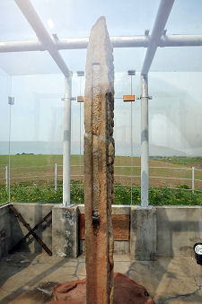 The Shandwick Stone or Clach a' Charridh stands in a magnificent location overlooking the sea a little distance from a minor road that heads inland from the southern end of Shandwick, which itself forms a south-western extension of Balintore in Easter Ross. A pull-off area has been provided not far away, and a path had been built from the road to the glazed shelter that has been the stone's home since 1988. (Continues below image...)