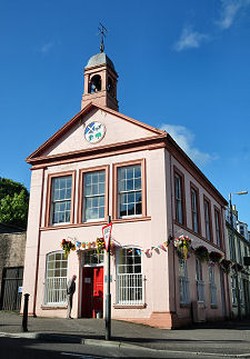 In many ways the most striking building on Eglinton Street is Beith Townhouse, a rather fine confection of pink harling and built to a scale which makes you think of an oversized dolls' house. This was built in 1817 by the architect William Dobie. It originally comprised a court house and reading room on the first floor, with shops and a cell on the ground floor. To the side of the Townhouse is The Strand, a street which climbs to become Townhead Street. Enjoying an elevated position on this side of the town is Beith Parish Church, built here between 1806 and 1810.