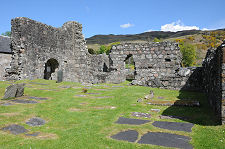 The priory itself is reached by walking from the car park around to the left of the later (and private) Ardchattan House and associated buildings. The fine Ardchattan Garden, for which an admission charge is made, is well worth a visit: see our separate feature about it. The priory may also be reached on foot along a drive from a jetty on the shore of the loch, which leads to the rear of the complex of buildings.