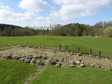 From the church, you should continue west for several hundred yards. Here you find that, although nothing remains of this part of the Antonine Wall, there are still traces of one of the forts that helped guard it. These are visible on the ground as humps and bumps, and original post holes have been used to place posts showing the shape of some of the elements of the fort. Meantime, the main roadway entering the fort from the north is visible on the ground following excavation.