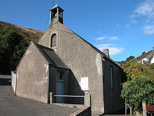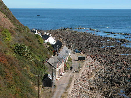 But the remainder of the village lies down the steep cliffside road. One group of buildings cluster around the church at an elbow in the road half way down the cliff. Three other groups of buildings occupy the shelf at the foot of the cliffs. The most northerly is known as Partanhall. This is a single line of cottages separated from the high water mark only by the width of the track leading round to Burnmouth Harbour.
