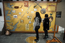The large visitor car park can be found immediately in front of the main distillery buildings, and the visitor centre occupies a building off to the left hand side of the car park. This turns out to be much more welcoming and spacious than seems possible from the outside, and comes complete with an open beam ceiling. The visitor reception is to one side, while other areas are given over to a well stocked shop, to comfortable seating areas, and to an impressive wall map setting out aspects of Highland history which had an effect on Dalwhinnie.