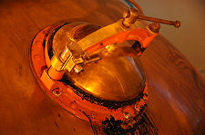 Visiting the still house at Dalwhinnie Distillery is a spectacular experience. It is only home to two stills, but they are very large in size. When the scale of the stills is combined with unusual orange spotlighting, the immediate effect when you enter is to leave you wondering, however momentarily, whether you have somehow been transported to Cape Canaveral for a night launch of a spacecraft. The design of the still house offers a high level walkway that allows you to view the stills from a number of different angles. The spirit safe, manufactured by R.G. Abercrombie & Co. Ltd. of Alloa in 1965, is tucked away at one end.