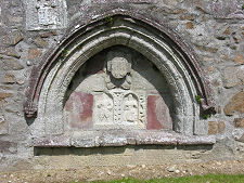 The surviving structure of Old Kirk contains a number of interesting features. These include a well preserved aumbry near a blocked doorway in the north wall of the nave. This is an inset stone cupboard which would originally have been used to hold the vessels used in services, and is now home to a modern memorial. The outside of the south wall carries an arched recess which was probably home to an effigy before the Reformation in 1560. Inset carvings dated 1603 seem to represent a male and a female. It is debatable whether the remains of a coat of arms above them were inserted in 1603 or date back to the original use of the recess.