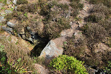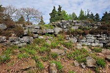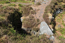 Tappoch Broch occupies the summit of the hill you climb to reach it, and your first glimpse of it through the trees is as a heather and bracken-clad mound. How much of the mound you can actually see will depend on the time of year you are visting. If the bracken is in full growth, then it takes over the exterior nearly completely, seriously obscuring details that might otherwise be visible. As you come a little closer, the path leads you between banks (or through a forest of bracken) to what initially appears to be a very odd structure, a bridge of stone laying across the path with a gap beneath. The "bridge" is in fact the lintel over the start of the entrance passage into the broch itself. The structure would once have been many metres higher than it is now.