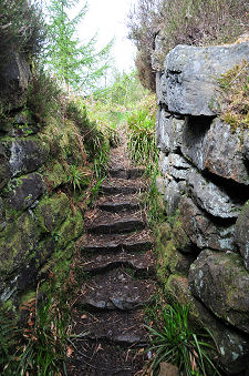 The path to Tappoch Broch from the track is just over a third of a mile long, and climbs gently as it twists and turns though cleared areas and the remaining dense growth of conifers. In places, despite the waymarking, the path is so indistinct that a little care is needed to follow it on the ground, while in other places its course is only too obvious as the passage of boots and cycle tyres have churned it into a surface that can be very muddy after rain.