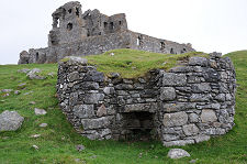 And it is from the A941 that Auchindoun Castle can be reached. As the road climbs south after turning off the A920 not far from Dufftown itself, a signposted track ascends to the left. When we last visited the only parking was in a pull off beside the main road. We understand that since then a parking area has been constructed at the top of the track. From the track you follow an offshoot to an old farmstead before a final few hundred yards skirting fields along an obvious path to the open land around the castle itself. Good footwear is recommended, especially for the last stretch of track which can be pretty muddy after bad weather.