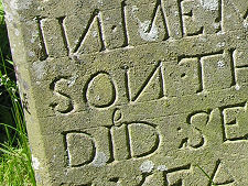 In the churchyard here, some of the most poignant memorials are those carrying text. An especially interesting touch is the presence on some stones of engraved "guidelines", faint straight lines above and below each line of text to ensure the mason kept his letters of even height and his lines straight. This has not prevented all error, however. A stone commemorating 7 year old Thomas Watson who died in September 1796, is carved in capital letters, and every "N" is carved backwards: while the "DID" on his stone has a small "e" superimposed to turn it into "DIeD".