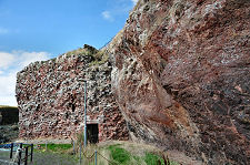 Overlooking Dunbar Harbour and best viewed from the grassy bank near the leisure centre. Access is not allowed: the ruins are in a dangerous state.