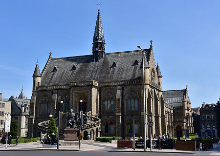 The west end of the building started life as a memorial to Prince Albert and was designed by George Gilbert Scott. It opened in 1867 as The Albert Institute. The site had previously been an area of wetland called Quaw Bog and a tower that had originally been planned was abandoned because of concerns about the stability of the ground. (Continues below images...)