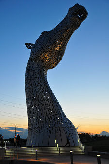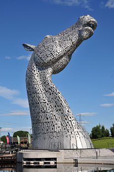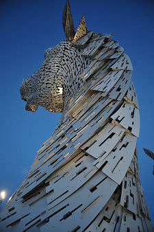 This page, however, carries the title "The Kelpies". Why start with a discussion of Scottish canals? The Kelpies are two magnificent 30m high steel horses' heads that were built in 2013 and stand beside the canal basin previously forming the end of the Forth and Clyde Canal, and beside the M9 motorway. They were erected in 2013 and have become as iconic in their own way as the Angel of the North since its completion on a site beside the A1 in Tyneside in 1998.