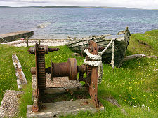 North of Brough Lodge the road leads to Fetlar's new ferry terminal at Hamars Ness, just around the point from the old ferry terminal at Oddsta. Not far away is a relic of an even older ferry service. At the end of the east west road near Brough Lodge you can still see the old pier with a heavily rusted winding gear nearby.