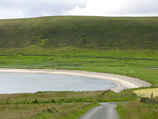 If Fetlar itself is very irregular in shape, its road network is surprisingly symmetrical. A single road runs north-west to south-east for the length of the island. At both ends there is a spur leading to the north, while in the centre there is an angular loop reaching the south coast at Tresta.