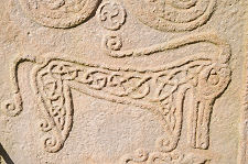 Below the fish monsters is a decorated beast of a design usually referred on Pictish symbol stones as an elephant. It is unclear whether this design was literally intended to depict an elephant when used by Pictish masons, or whether this is simply a description that suited our more recent ancestors who first systematically studied these stones. Either way, this particular example is a rather pretty beast, and about as unlike an elephant as it is possible to imagine.