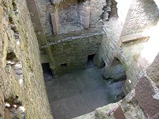 The ground floor of the tower house forms a large stone-vaulted cellar. This would originally have been subdivided both by a wall within the lower cellar and by a floor, creating two different levels of storage. At upper cellar level is the access to the murder hole over the main door, designed to provide an added deterrent to unwanted callers. Nearby is the entrance to the upper level of the prison. This is a pretty grim space, though it is provided with a latrine and a small window, making it vastly more comfortable than the horrible pit prison below it into which those who had really offended the McCullochs were thrown to rot.