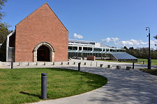 The gallery housing the collection lies within a large grassy clearing surrounded by woodland. Rather than being placed centrally within the clearing, the almost triangular building has been built with its longest face close against the edge of the trees. As this face is constructed largely of glass, the effect is to give the feeling that the gallery actually merges into the woods.