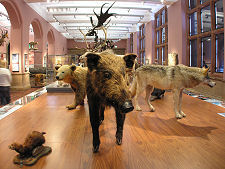 The "life" side of the themed approach gives ample scope for Kelvingrove's world renowned collections of stuffed or mounted fauna. These range from the superb butterflies all the way up the size scale to Sir Roger. Sir Roger was an elephant who spent the 1890s with a travelling circus before retiring to a zoo in Glasgow. In 1900 he developed a hormonal disorder that made him very aggressive, and as a result dangerous. He was therefore shot one morning while eating his breakfast. He was put on display at Kelvingrove in 1901 and has stayed here ever since. Too large to move during the renovation of the museum, he was simply left in place, protected within a wooden box.