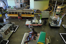 Carrying on the three dimensional theme, the bicycle velodrome, almost in the form of a very large bicycle wheel, hangs overhead in the body of the museum, with part of the museum's collection of bikes attached. But perhaps the most impressive excursion into the third dimension is the way a railway steam engine has been displayed on the first floor, with its front projecting out over part of the main floor below. The result is a highly unusual, and oddly fascinating, view of the engine from some distance below.