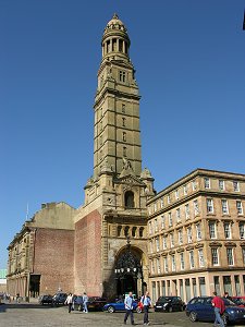 Greenock itself remains home to many fine buildings. The most spectacular of them is Greenock Municipal Buildings and its 245ft high Victoria Tower. The impressive exterior is matched by an ornate interior. It was completed in 1886. One corner of the Municipal Buildings, next to the base of the tower, comprises just brick faces quite different from the rest of the building. This is Cowan's Corner. It was named after a local shopkeeper, Robert Cowan, who ran a shop on this site and refused to sell up to make room for the Municipal Buildings. As a result they were built with his shop inserted into one corner. The shop was destroyed during a bombing raid in May 1941, leaving the slightly odd effect you see today.