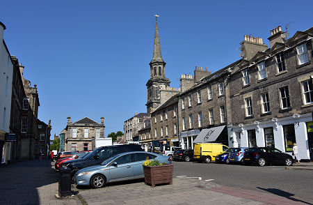 The centre of Haddington is built attractively around the core of High Street and Market Street. This gives two nearly parallel market areas, separated by buildings and a warren of wynds and lanes. The mercat cross is in High Street and the two streets come together at their western end on either side of the Town House. This was built in 1742 with some of the textile wealth then starting to flow into the town, and its spire dominates many views of Haddington. It continues to be used today by East Lothian Council.