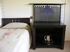 The upper floor of the house is dominated by the main bedroom. This is L-shaped and the carved white bed and range of built in cabinets occupy an alcove covered by a barrel vaulted ceiling. Classic Mackintosh/Macdonald themes are everywhere you look, from the rose-coloured glass squares in the window shutters and cabinet doors to the ladder backed chairs. Especially striking are the silk embroidered hangings produced by Margaret Macdonald either side of the head of the bed, depicting elongated figures of women.