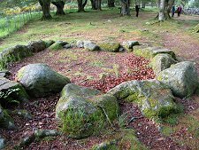 The North-East Passage Grave (the one nearest the car park) is interesting in having a large number of "cup" marks and some "ring" marks inscribed on one of the kerb stones. Both of the passage graves have a surrounding circle of widely spaced standing stones: though sadly the stone circle surrounding the South-West Passage Grave has a road going through it, leaving one stone marooned on the far side of the road and another forming part of the fence.