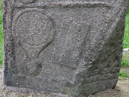 As you approach along the path from the small car park you first see the east or "back" side of the stone, which also happens to be the better preserved of its faces. This is divided into four panels running down its length. From top to bottom these contain a scene of animals; a geometrical Pictish symbol; a "beast", possibly an idealised dolphin; and a mirror and comb.