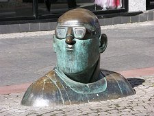 In the centre of Kilmarnock Cross is a fine statue commemorating the poet Robert Burns and his printer, John Wilson, who printed the first edition of Burns' poems nearby. This is one of a number of fascinating pieces of street art dotted around the town centre, which include the head and shoulders of a figure shown on this page.