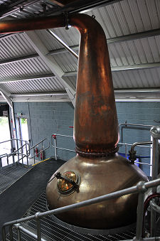 The sugary "wort" from the mash tun is then cooled to 20°C and placed in one of the four stainless steel washbacks, where it ferments to produce alcohol (think of it like making beer). This takes 65-85 hours and produces a "wash" with an alcohol content of about 8%. The wash is then distilled twice, first in the wash still, and secondly in the spirit still. The process is controlled from a single spirit safe, a locked brass and glass cabinet through which the spirit flows while the stills are in operation.
