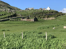Beyond the car park at Blairmore the road takes you to Balchrick, with a side turning that leads to Droman and its pier. Further on you come to Sheigra, the last grouping of dwellings, and a side road that leads to another cemetery. This also has a superb location, but the surrounding wall of blocks seems unlikely to make the most of the view for the residents.