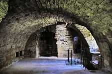Below the hall were the first floor kitchens, accessed by a spiral stair from the hall, while on the ground floor, and originally accessible only via a hatch and ladder, were the storage cellars. In the 1800s, in order to assist access by early tourists then starting to visit the castle, a door was knocked through into the cellar from the outside and steps built from the cellar to the kitchen.