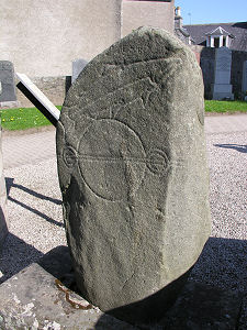The stone carries carvings on both sides, though the style of the carving is different on the two faces and it is thought that the work was done by two different artists and possibly at different times. The side facing the wall surrounding the churchyard carries a carving of a triple disc crossed by a bar, which some have interpreted as a cooking pot hanging above a fire viewed from above. Above it is the detailed carving of a salmon. The reverse side carries poorer carvings of common Pictish patterns described as "V-rod, crescent and beast". The V-rod has been interpreted as a broken arrow, and the "beast" may be a stylised dolphin.