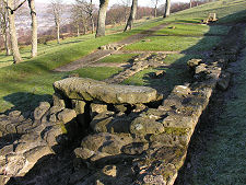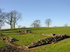 ![]() Bar Hill Roman Baths from the East. The line of the Antonine Wall is some way downhill to the right, and continues along the distant hedge line glimpsed coming in from the right-hand edge of the picture. |