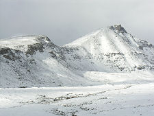 Most climbs start from the car park on the east side of the A894 close to its highest point on Quinag's flank; at map reference NC233273. From here you follow the path up to the low ridge that crosses the entrance to the huge bowl that lies between two of Quinag's peaks, Spidean Coinich to your left and Sail Gharbh ahead and to your right. (Continues below image...)