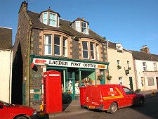 Lauder is most easily described as a small elongated town built along the line of the main A68 from Edinburgh to Darlington. Much of the medieval street plan remains. The broad central Market Place is divided by a line of buildings called Mid Row, at the north end of which is Lauder Town Hall, variously used over the years the tolbooth, the town jail and the council meeting place.