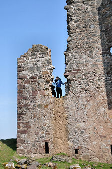Today the castle comprises a finger of stone, pointing accusingly at the sky. Just enough remains to identify it as once having been a three storey tower house of traditional design, including a corbelled section that once housed the main staircase and part of a vaulted basement level. Across the narrow neck of the promontory is a dry stone wall that marks the line of an old defensive wall: traces of the original defensive ditch here can still be seen.