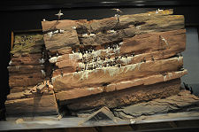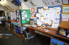 The visitor centre's most obvious exhibit stands outside the front of the building and comprises a collection of very large chunks of the rocks of Assynt. The geology of the area is one of its most striking factors, and it is interesting to see some of the component parts set out to be seen and touched. This is a theme that recurs within the centre, as is another which becomes obvious before you enter. A large window by the door is home to a magnificent tiled vista of Loch Inver and Lochinver complete with a large heron. This was produced for the centre by Highland Stoneware Pottery, based in Lochinver.