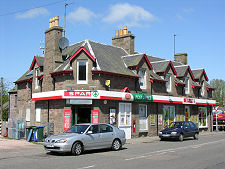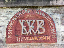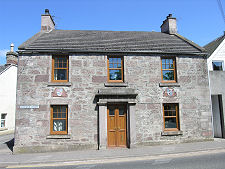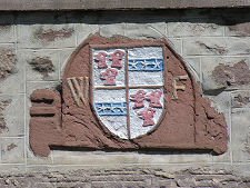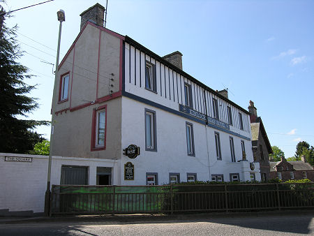 There are exceptions to the general colour scheme, the most striking of which is the Kinloch Arms Hotel. This stands on the south side of "The Square", a name that has been overtaken by the way the A94 now presses on through the village. Nearby on Forfar Road is a fairly ordinary stone house which carries carvings of two coats of arms on its front wall and a set of initials on its gable end. We have not been able to uncover its story.