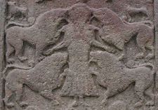 In the centre of the rear of Meigle 2 is a panel that has been interpreted at least two ways. The straightforward view is that it is a picture of Daniel surrounded by four lions. A more fascinating interpretation is that it is a picture of the execution of Vanora, or Queen Guinevere, of Arthurian fame. The story goes that Guinevere was kidnapped by Pictish King Mordred, and held near Meigle. When she was released, it is said that King Arthur had her put to death by being pulled apart by wild animals, and her remains were buried at Meigle. The carvings are a little faded, but sadly they do look much more like lions than anything likely to have been found in Pictland.