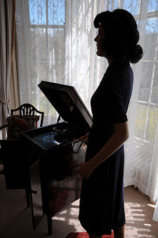 The drawing room has a very different feel, and captures a moment in May 1945. Many of the clothes on view are the product of wartime austerity measures and include the use of fabric originally intended for furnishings and rayon. The 1945 atmosphere is enhanced by the soundtrack playing in the background.