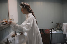The National Museum of Costume presents a series of core exhibitions which examines fashion and social etiquette over the century from the 1870s to the 1950s. Each of the rooms within the house are presented to show a function or gathering taking place at a particular moment in time within a country house setting. Each year part of the museum is given over to a different special exhibition. In 2009 an exhibition covered the life and work of the Scottish clothes designer Jean Muir. Pictured on this page is the 2010 special exhibition, "Marriage in the Movies", featuring beautiful costumes worn by brides from film and TV productions, including "Pride and Prejudice", "Mansfield Park", "Howards End", "Tess" and "Frankenstein". During the currency of the exhibition brides arriving at the museum in their wedding dresses gain free admission.