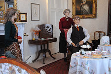 The library presents another complete change of feel, and though it is not immediately obvious, another move forward in time. It is 31 December 1952 and the family are gathering prior to going out to the annual Hogmanay Ball held by the Dumfries Chamber of Commerce. The 1950s evening dresses worn by the mother and daughter are splendid, as is the library setting. The portraits on the walls are all associated with the Stewart family and as already noted the bookcase is made from wood felled on the estate.