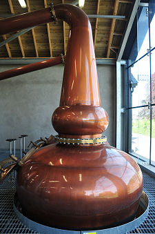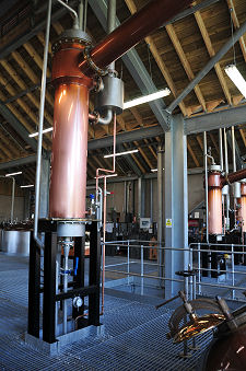 The rest of the production area is on one large upper floor. Here you can find mash tun and four pine washbacks. The highlight of any distillery tour is inevitably the stills. At Lindores they are set close to the huge glass wall that forms the north side of the upper floor of the distillery. This looks out across a minor road to the ruins of Lindores Abbey and provides a stunning backdrop. From a photographer's point of view this also means that the stills can only be seen obliquely, or in silhouette. However you look at them, there's no escaping the fact that those at Lindores are rather unusual. There are three stills, a large wash still and two smaller spirit stills, which work in parallel. This approach offers more contact with the copper of the spirit stills, which is believed to have a beneficial effect on the product, and at a more prosaic level it got round an issue over the available height in the production building.