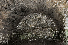 The most impressive structure still standing at Dunollie Castle is the keep, which stands at the north-east corner of the castle, set diagonally and defending the only easy approach. The keep measures, externally, some 39ft by 37ft, and has walls of between 9ft and 11ft in thickness. A doorway on the south-west side leads into a vaulted ground floor chamber that would probably have provided secure storage during the castle's active life. There are traces of two slit windows, one on the south-west wall and one on the south-east, both looking out into the courtyard.