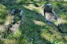 What you find on top of Abbey Knowe today, apart from an extremely helpful interpretative board, is traces of the stones that once lined three "cist" (or stone lined) graves. These are aligned east-west and from their size are probably the burials of small children. They were excavated in 1998 and are though to be what remains of a once larger burial ground: with the rest apparently since destroyed by erosion, by rabbit burrows or by quarrying on the west side of the Knowe.