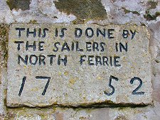 The ferry carrying this traffic became the Queen's Ferry: and its landing points became North and South Ferry or, increasingly, North and South Queensferry. A poignant reminder of earlier times can be seen at the little walled graveyard in the heart of North Queensferry, on the site of the Chapel of St James. A stone has been set into the outside of the wall near the gate. It is inscribed "This is done by the sailers of North Ferrie 1752" (see photo on this page).